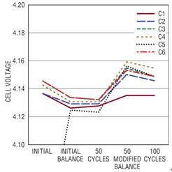 電池組 1 經過了 100 個充電 / 放電周期,圖 3 顯示若干周期后記錄 6 節電池的電壓。該圖顯示,經過短暫停頓后,在一個完整的充電周期結束時所測得的電池電壓。充電后,電池電壓之間的不平衡與容量和內部電阻的小量變化有關。在第一個完整的周期中,測得的電池組容量為 2.072AHr,經過 100 個周期后,所測得的容量為 2.043AHr,隨著周期數增加,容量有少量下降。還有一種趨勢,即隨著充電 / 放電周期數的增加,充電后電池的最終電壓下降了,100 個周期以后,這種趨勢尤其顯著。這種趨勢最有可能是因為電池老化引起電池內部電阻的小量增加導致的。內部電阻增加使電池更快地達到充電結束門限。盡管在工作時沒有平衡,這個電池組在 100 個周期中自始至終保持著同樣程度的不平衡。能像這個電池組一樣,每節電池自然而然相互匹配的電池組相當罕見。