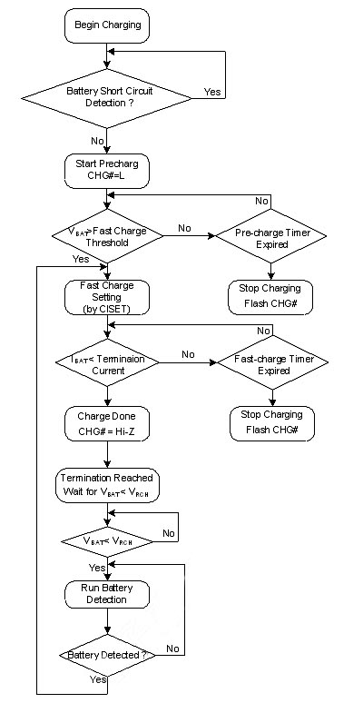 圖6所示為鋰離子電池充電器的標(biāo)準(zhǔn)充電流程,首先充電IC偵測(cè)是否有輸出短路或是過(guò)載的保護(hù)模式,若系統(tǒng)一切正常接著偵測(cè)電池初始電壓是否達(dá)到3V以上,高于3V者就直接以快充模式進(jìn)行高電流充電,若電池低于3V者,進(jìn)入預(yù)充電模式,以快充的10%進(jìn)行充電,喚醒電池并避免電池?fù)p壞。在預(yù)充電階段,仍隨時(shí)偵測(cè)電池電壓,達(dá)到3V后可隨即切入快充模式。