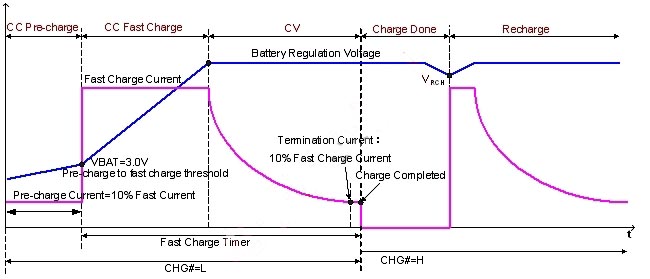 在快充模式下,電池的電壓以較高速度上升,升高至4.2V時(shí),切換至4.2V的定電壓充電,由電池本生的內(nèi)阻進(jìn)行限流,此時(shí)充電電流就如同圖1的CV階段。隨著時(shí)間過(guò)去,充電電流呈現(xiàn)指數(shù)曲線遞減,當(dāng)?shù)竭_(dá)設(shè)定電流ICHG的10%,即關(guān)閉充電器,同時(shí)指示充電完成。