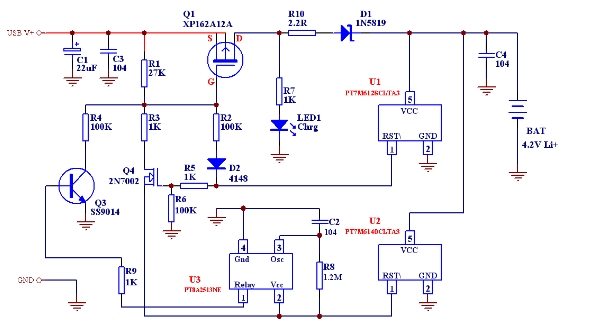 PT7M7433T是上海百利通公司最新設計的極高精度的一系列電壓檢測器的其中一款,其檢測精度在0-Vcc (5.5V)范圍內小于1mV,而且其批量IC的檢測值偏差<±2.5%,這樣完全保證了批量產品的性能一致性和極高的總體性能,我們利用其配合少量外部電路即可組成相當簡單的鋰電池充電線路。