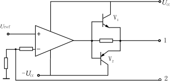 JTU—100型電子負(fù)載的原理圖如圖2所示,它最大可以吸收10A的電流,圖中V1、V2為調(diào)整管,Uref為可調(diào)基準(zhǔn)源,1、2為輸出端,調(diào)節(jié)Uref的大小,不管負(fù)載如何變化,都可以在1、2端得到設(shè)定的電壓。