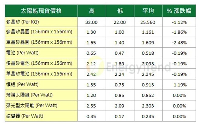 本周現貨報價部分,多晶硅 、硅晶圓 、與電池依然同步呈現走跌的趨勢,但除單晶硅晶圓外,跌幅都出現減緩的狀態。在多晶硅方面,目前成交價最低仍維持在每公斤23美元,而平均價位下滑到每公斤25.56美元,跌幅為1.12%;而在硅晶圓部分,多晶的最低價格仍然維持在每片1.0美元;而單晶的最低價格則為每片1.4美元;本周多晶硅晶圓的平均價格來到每片1.161美元,跌幅為1.86%;而單晶硅晶圓則來到每片1.609美元,跌幅為2.48%。