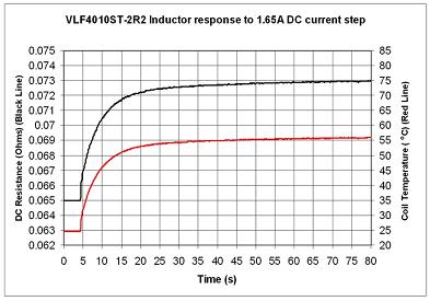 圖5中所示的測試示例在LM3554的電路中使用了VLS4010ST-2R2,直流電流階躍為1.65A。室溫時的電阻開始時為65mΩ。超過30秒之后,電感器達到穩(wěn)態(tài),電阻變?yōu)?3mΩ,相應(yīng)的穩(wěn)態(tài)工作溫度大約為 56℃。