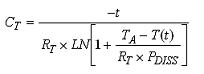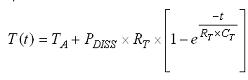 在穩(wěn)態(tài)下,LEDI/NTC的ESD二極管的VF為-622mV,對應(yīng)結(jié)溫 95.2℃(環(huán)境溫度為25℃時)。在穩(wěn)定狀態(tài)下,測得的PFET導(dǎo)通電阻為154mΩ,對應(yīng)結(jié)溫105℃。圖3 還描繪了LM3554的熱容。VF和RPMOS的響應(yīng)表現(xiàn)呈現(xiàn)類似于一階RC的指數(shù)級上升,計算等式如下: