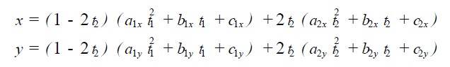 式中a1x , b1x , c1x , a1y , b1y , c1y為Si 段曲線的系數(shù),由Pi , Pi + 1 , Pi + 2三點控制,參變量為t1 ,在公共段范圍內(nèi)t1∈[0. 5, 1 ];式中a2x , b2x , c2x , a2y , b2y , c2y為Si + 1段曲線的系數(shù),由Pi + 1 , Pi + 2 , Pi + 3三點控制,參變量為t2 ,在公共段范圍內(nèi)t2 ∈[0, 0. 5 ]。