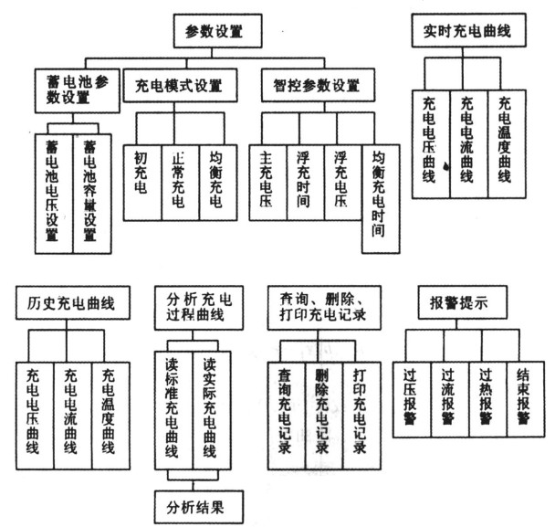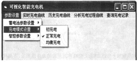 在參數(shù)設(shè)置中可以對框圖中所示的條目進行設(shè)置,使得該系統(tǒng)具有很強的通用性。電動車電池一般由幾個單體組合而成,可以選擇單體個數(shù)以確定電池組的電壓和容量。該系統(tǒng)提供了如框圖所示的三種充電模式,一般新電池前五次充電要進行初充電以充分激活電解質(zhì),當單體電量不同時要均衡充電,其余時正常充電。還可以按照需求設(shè)置不同充電階段的充電時間,來滿足各種電池的不同需求;實時充電曲線實時地顯示充電電流、電壓和電池溫度;歷史充電曲線可以顯示該電池組充電歷史;通過分析充電過程曲線即可了解電池存在的問題,如:蓄電池缺乏電解液、電解液比重不符合要求或蓄電池單體存在差異等,從而及時的對電池進行保養(yǎng);該系統(tǒng)還提供了按日期或電池編號查詢、刪除充電記錄的數(shù)據(jù)庫功能,方便了操作;報警提示用來告知用戶充電的過壓、過流、過熱情況以及充電是否結(jié)束。