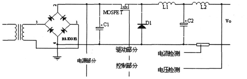 在主充電路中, 220 V電壓經(jīng)變壓器降壓后,由整流器整流和大電容C1 平滑濾波,作為直流充電電源。MOSFET、二極管D1、電感L1 和電容C2 構(gòu)成主充電路。在工作過程中, PWM控制信號的高電平脈沖出現(xiàn),使MOSFET導通之后,電感L1 的電流不斷增大,電容C2 充電,主充變換器不斷存儲能量,同時通過電感L2 對電池充電,此時,續(xù)流二極管因反向偏置而截止。經(jīng)過PWM高電平脈沖持續(xù)時間后, PWM信號變低,MOSFET截止,電感L1 中的電流減小, L1 兩端的感應電動勢使續(xù)流二極管導通, L1 中的存儲電流和電容C2 存儲電荷向電池充電。經(jīng)過PWM信號的低電平持續(xù)時間后, PWM信號的又一高電平脈沖到來,再度使MOSFET導通,上述過程循環(huán)交替。電感L2 的作用是平滑充電電流.
