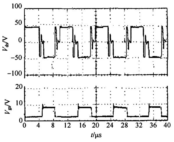 通過理論研究及仿真分析, 可以看出, 交錯(cuò)并聯(lián)的低壓大電流DC - DC 變換器具有良好的性能,在輸出為1125 V/ 60 A 的情況下, 輸出電流紋波可以降到很小。為了進(jìn)一步說明這種拓?fù)浣Y(jié)構(gòu)的可行性, 用實(shí)驗(yàn)結(jié)果驗(yàn)證。實(shí)驗(yàn)電路見圖4 , 實(shí)驗(yàn)參數(shù)和仿真相同, 最后得到如圖9 所示的實(shí)驗(yàn)波形。圖9 中, V gs為一次側(cè)一個(gè)MOSFET 的門極驅(qū)動(dòng)電壓波形, V ds則為相應(yīng)的MOSFET 的柵源電壓波形,從圖9 可以看出, 實(shí)驗(yàn)結(jié)果所得波形同圖5 的理論分析結(jié)果十分吻合, 所提出的方法是可行的。其中, 變壓器選用R2 KB 軟磁鐵氧體材料制作的GU22 磁心, 原副邊的匝數(shù)分別為8 匝和1 匝; 電感選用寬恒導(dǎo)磁材料IJ 50h 制作的環(huán)形鐵心T5 - 10 - 215 ,匝數(shù)為8 匝。