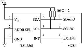 TSL2561可以通過I2C總線訪問,所以硬件接口電路非常簡單。如果所選用的微控制器帶有I2C總線控制器,則將該總線的時鐘線和數據線直接與TSL2561的I2C總線的SCL和SDA分別相連;如果微控制器內部沒有上拉電阻,則還需要再用2個上拉電阻接到總線上。如果微控制器不帶I2C總線控制器,則將TSL2561的I2C總線的SCL和SDA與普通I/O口連接即可;但編程時需要模擬I2C總線的時序來訪問TSL2561,INT引腳接微控制器的外部中斷。硬件連接如圖3所示。