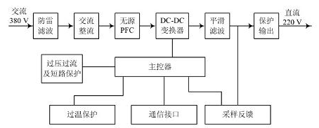 本文設計的整流模塊的工作原理框圖如圖2 所示,工作時, 模塊首先通過過防雷處理和濾波對輸入的三相交流進行處理,這樣才能保證模塊后級電路的安全; 經(jīng)過處理后的三相交流經(jīng)過整流和無源PFC 后轉換成高壓直流時,這時轉換的高壓直流要經(jīng)過DC/DC變換器再次轉換成可變的直流電壓輸出; 另外模塊控制部分還有負責過壓、過流以及短路保護等作用,這樣才能保證輸出電壓的穩(wěn)定, 也同時能對模塊各部件進行保護。模塊還在遠程監(jiān)控中提供了 四遙 (遙控、遙調、遙測、遙信) 接口。[page]