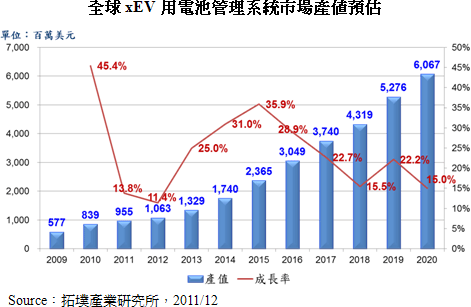 因此,透過BMS能準(zhǔn)確量測電池組使用狀況,保護(hù)電池不至于過度充放電,平衡電池組中每一顆電池的電量,以及分析計算電池組的電量并轉(zhuǎn)換為駕駛可理解的續(xù)航力信息,確保動力電池可安全運(yùn)作。拓墣預(yù)測2012年全球BMS市場產(chǎn)值成長逾10%,2013年至2015年成長幅度將大幅躍升至25%~35%。