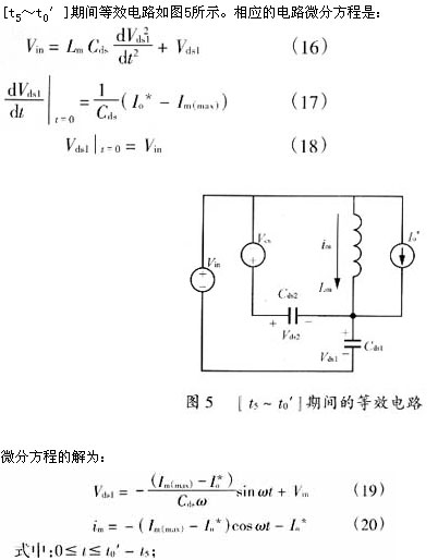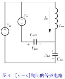 當輔助開關sa斷開后,由于磁飽和電感ls瞬間相當于開路,因此變壓器勵磁電流可完全用來對cds2和cds1充放電。[t4~t5]、[t5~t0′]期間,等效電路同圖4。顯然,令式(21)和(24)中io*或io為零,即可得到主開關管零電壓導通的能量條件和時間條件,im(max)≥cdsωvin,即: