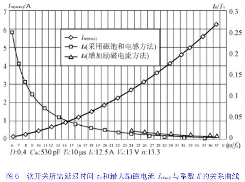 6)設定死區延遲時間td,針對不同的軟開關實現方法,分別從式(21)、(24)或(25)、(26)求出所需的系數k。