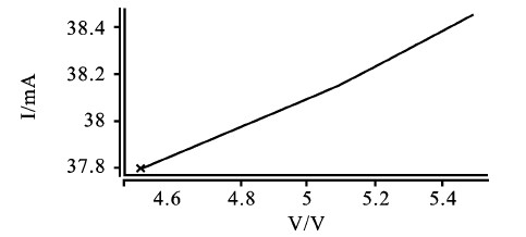 設置Rset為500Ω、Vcc為3V,令5V電源電壓產生±10%的波動,此時恒流輸出情況如圖5.驅動電流由37.8mA變化到38.5mA,波動百分比為1. 85%。
