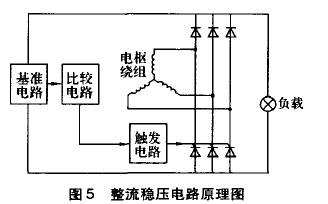 設計的釹鐵硼永磁發電裝置結構示意圖如圖4所示,還研制了三相半控橋整流穩壓電路(圖5)。該電路由三相半控橋整流電路、電壓信號取樣電路和觸發電路組成。當發電機輸出電壓低于目標穩壓值時,電子穩壓器為三相整流輸出。當發電機輸出電壓高于目標穩壓值時,電壓信號取樣電路自動使三相半控橋整流電路瞬時斷開,降低輸出電醫當發電機輸出電壓再低于目標穩壓值時,三相半控橋整流電路再恢復工作,周而復始。通過整流、斬波,保證了發電機輸出電壓穩定的直流電。