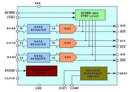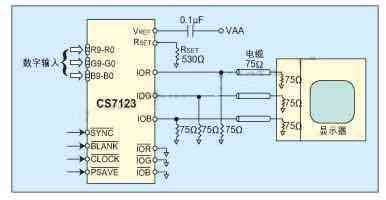 CS7123還有SYNC同步信號和BLANK黑電平控制信號這兩個(gè)附加的視頻控制信號,CS7123也具有一個(gè)待電模式。CS7123采用5V CMOS工藝制造,單片CMOS結(jié)構(gòu)確保了低功耗性能。CS7123的主要功能是將三路RGB信號轉(zhuǎn)換為模擬RGB信號后輸出到顯示屏顯示。另外,它也可以當(dāng)作三路單獨(dú)的DAC使用。