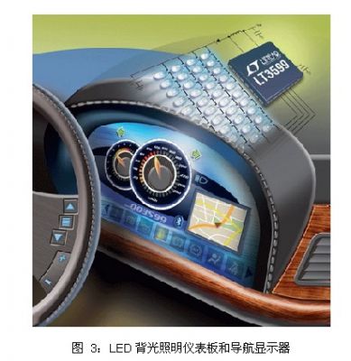 諸如尺寸小、壽命極長、功耗低和調(diào)光能力增強等優(yōu)勢已經(jīng)導(dǎo)致 LED TFT-LCD 背光照明在今天的汽車、卡車、火車、飛機和輪船中得到了廣泛采用。LED 背光照明主要是從信息娛樂系統(tǒng)開始的,這類系統(tǒng)一般有一個 LCD 顯示屏,安裝在儀表板中央某個部位,以便駕駛員和乘客都能非常容易地看到它們的位置、執(zhí)行音頻調(diào)諧和其他各種任務(wù)。很多新出現(xiàn)的汽車設(shè)計都利用單個儀表板,以對方便駕駛員實施控制的所有顯示儀表進行背光照明,如圖 2 所示。對儀表板的 LED 背光照明常常是與信息娛樂系統(tǒng)共用的,從而非常容易讀取控制板上的數(shù)字。類似地,包括轎車和火車在內(nèi)的很多車輛以及還有安裝在飛機座椅背后的 LCD 顯示器,可供乘客看電影、玩視頻游戲等等。歷史上,這類顯示器一直使用 CCFL 背光照明,不過用非常扁平的白光 LED 陣列替換相對較大的 CCFL 燈,以提供更準確和可調(diào)節(jié)的背光照明以及能超過車輛或飛機壽命的工作壽命,這已經(jīng)變得越來越常見了。
