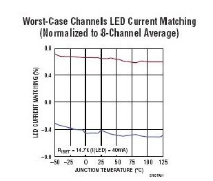 LT3760 采用自適應(yīng)反饋環(huán)路設(shè)計,該設(shè)計調(diào)節(jié)輸出電壓以使其略高于 LED 串的最高電壓。這最大限度地減小了通過鎮(zhèn)流電路損失的功率,并幫助優(yōu)化了效率。圖 2 中的電路提供高于 90% 的效率。這很重要,因為消除了任何散熱需求,從而實現(xiàn)了占板面積非常緊湊的扁平解決方案。就驅(qū)動 LED 陣列而言,同樣重要的是,提供準確的電流匹配,以確保在整個儀表板上保持背光照明亮度一致。LT3760 在 -40度 至 125度的溫度范圍內(nèi)保證 LED 電流變化不到 ±2%,而且正如在圖 5 中能看到的那樣,它的典型值較接近 ±0.5%。