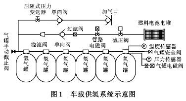 為了保證燃料電池汽車的安全穩定運行,需要設計一套安全有效的供氫系統。在燃料電池汽車上,供氫系統一般包括電磁閥、安全閥、溢流閥、熱熔栓、手動截止閥、溫度傳感器和壓力傳感器等在內的輔助安全裝置,其示意圖如圖 1 所示[9]。車載供氫系統安全措施應從預防與監控兩方面著手。從預防的角度來說,筆者以國內研發的燃料電池中巴車為例,給出了車載供氫安全實例。