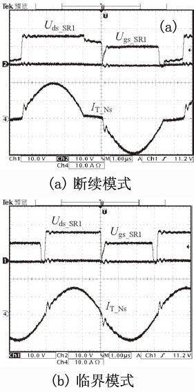 本文針對倍壓整流結構提出的一種新型的電流型同步整流方案,如圖10所示。通過一個雙繞組電流互感器,既解決了二次側上管驅動電路采樣的能量回饋問題,又減少了電流互感器的數量,有利于降低生產成本,提高變換效率及功率密度。圖11為斷續模式和臨界模式下的主要實驗波形。
