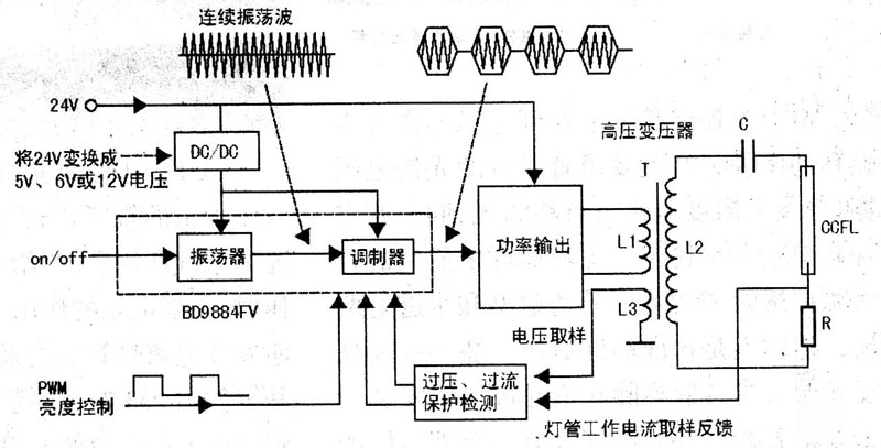 PWM調(diào)制信號改變輸出高壓脈沖的寬度,從而達到改變亮度的目的。在背光燈管點亮后,L2、C及燈管組合使高壓交流電正弦化(低Q值串聯(lián)諧振),電容C的容抗及L2的感抗對背光燈管又起到限流的作用。