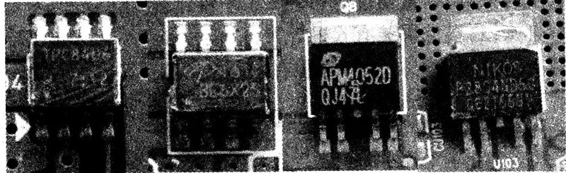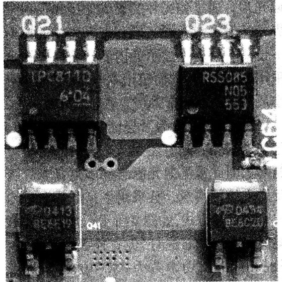 背光燈驅(qū)動板主要由振蕩器、調(diào)制器、功率輸出電路及保護檢測電路組成,如1圖所示。在實際電路中,除功率輸出部分和檢測保護部分外,振蕩器、調(diào)制器及控制部分通常由一塊單片集成電路完成,這類集成電路常用的主要有BD(Rohm公司生產(chǎn),如BD9884FV、BD9766等)及OZ系列(凹凸微電子公司生產(chǎn),如02960、02964等);功率輸出管多采用互補的功率型場效應(yīng)管,有的采用3腳和8腳(①~③腳為S極,④腳為G極,⑤-⑧腳為D極)貼片封裝型,常見型號有D454、RSS085、D413、TPC8110、FDD6635.FDD6637等,如圖2所示;還有的采用由N溝道和P溝道組合的5腳或8腳MOSFET功率塊(①腳為Sl極,②腳為Gl極,③腳為S2極,④腳為G2極,⑤~⑧腳為D1、D2極),如SP8M3、TPC8406、4614、APM40520、P2804ND5G等,如圖3所示。保護檢測多由集成電路10393、358、393或LM324及其外圍元件來完成。輸出電路主要由高壓變壓器、諧振電容及背光燈管組成,并設(shè)有輸出電壓、輸出電流取樣電路。