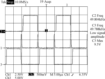 圖6(a)中,SG3525的兩路輸出vgs1及vgs2的最大占空比約為48.5%。死區時間可以根據電路需要任意調節。在PWM Buck三電平變換器中,開關頻率為50kHz,從圖中可以看出驅動信號的頻率即為所需。要實現對驅動信號頻率的調節也變得非常簡單,只需要調節SG3525的振蕩器頻率即可。