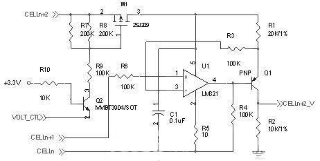 圖中CELLn為第n節單體電池的電壓,該電路可以對多串電池組的電壓進行測量,并且不受串聯節數的限制,而對串聯電池組中的第一節單體電壓不用采用該電路測量,可直接測量或者通過電阻分壓得到。該電路的工作原理如下:在電路正常工作時,運放處于放大狀態,運放的1、3腳為虛短虛斷狀態,即3腳的電壓等于CELLn+1端的電壓,而由于運放的輸入阻抗非常大,因此電阻R3上的電流可忽略,在電阻R1上就是一節單體電池的電壓,流過電阻R1的電流大小為: