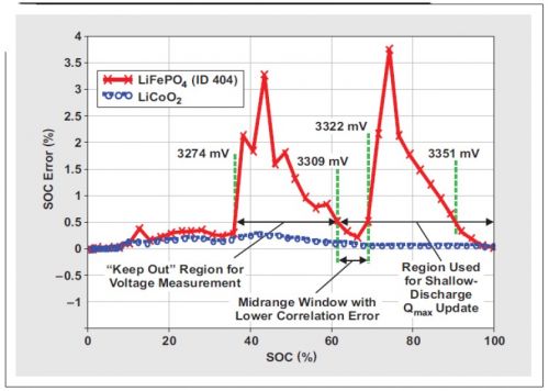 如表 1 所示,化學 ID 404 的 OCV 測量的不合格電壓范圍為 3274mV(最小值,即 ~34% SOC)到 3351mV(最大值,即 ~93% SOC)。大多數磷酸鐵鋰電池都有非常寬的不合格電壓范圍(參見化學 ID 409 進行對比)。然而,根據具體的電池特性,為淺放電 Qmax 更新找出一個更高的最小不合格電壓是可能的?;瘜W ID 為 404 時,將這一值升高至 3322mV 是可能的,從而允許 3309 到3322 mV 的淺放電 Qmax 更新窗口(請參見圖 2)。設計人員可以使用這種中間范圍低誤差窗口,實現數據閃存修改。由于僅能對高和低不合格電壓范圍進行設定,因此主系統必須保證在 3309mV 以下不會進行更低的 OCV 測量。(隨著關聯誤差的增長,OCV 測量誤差在 3274 和 3309mV 之間急劇增加。)雖然僅有一個 13-mV 窗口在更低 OCV 測量時起作用(3322 – 3309 mV = 13 mV),但其對應于一個 70% 到 64% 的 SOC 范圍。