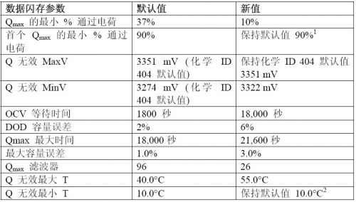 1、 該參數在黃金影像 (golden image) 過程期間很重要。如果使用的是標準 4.2-V 鋰離子電池,且僅將其充電至 4.1V 系統電平,則在電池充電至 4.2V 以后進行首次 Qmax 更新仍然必要,目的是滿足 90%容量變化的要求。根據電量計設定的化學 ID 編碼,對規定電池容量即“設計容量”和估計 DOD 的容量變化進行開始和結束點檢查。