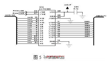 通過軟件參與設(shè)置,很容易得到全頻段內(nèi)的預(yù)置誤差數(shù)據(jù)。對于2-20GHz的微波振蕩器,如果每隔5MHz設(shè)置補(bǔ)償一個點(diǎn),那么存儲器至少需要3600個地址空間,在此選擇8k×8靜態(tài)存儲器芯片,存儲空間滿足要求。在時鐘的同步控制下,地址生成器產(chǎn)生對應(yīng)地址,該系列數(shù)據(jù)被存入RAM中,電路如圖5所示。