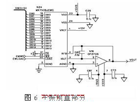 在主振預(yù)置電路D/A部分,為了照顧2-20GHz全頻段能有較為精細(xì)的預(yù)置分辨率,并且滿足△Data插值需要,在此選擇了14位D/A轉(zhuǎn)換器,使用時在數(shù)據(jù)范圍0~16383兩端預(yù)留一定的插值空間,電路如圖6所示。