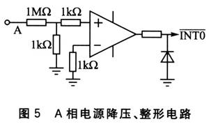 數(shù)字采樣方法具有數(shù)字濾波效果,對信號的通道干擾有抑制作用。設(shè)定每個周期采樣100個點,由定時器T0產(chǎn)生采樣時間間隔。將系統(tǒng)某相進(jìn)線電源(如A相) 信號經(jīng)過降壓、整形電路如圖5所示,轉(zhuǎn)換為方波信號。作為單片機(jī)中斷0的觸發(fā)信號,在正常情況下電源信號的頻率為50Hz左右,在兩次中斷期間,對剩余電流的采樣次數(shù)為100次。