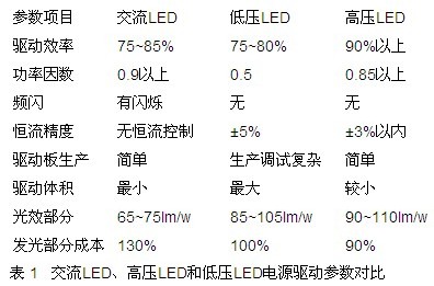 低壓LED驅動電源是從開光電源原邊反饋電路移植過來的產物,設計電路復雜,恒流精度誤差較大。小功率開關電源驅動方式驅動效率充其量設計到80%,LED應用開始要求功率因數,小功率電源并不具備。器件壽命受到限制,內置電源體積也受限,市場機會因此受到局限。 高壓LED是因上述問題而誕生的產物,集交流LED和低壓LED之優點,驅動效率及恒流精度大大提升,各項參數均優秀,性能價格比高。
