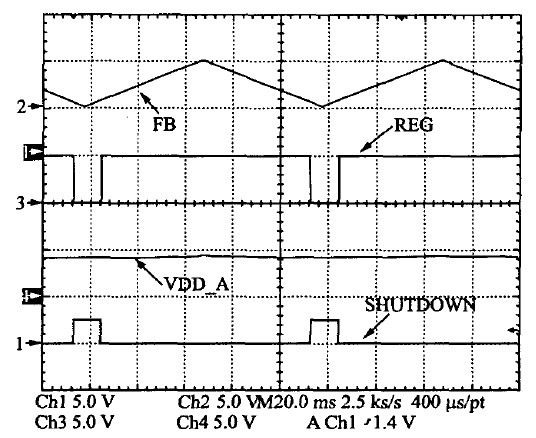 系統的多模式控制測試結果見圖13。中載或重載下系統采用PWM 模式工作,許多單元的供電電源為REG=5 V.極輕載條件下則關斷5 V的供電電源,減小系統的待機功耗,同時也有利于減小EMI和噪聲。其過程如下:當FB電壓低于一個閾值時,待機模式選擇,則SHUTDOWN信號變高,關斷5 V 電壓源REG模塊,同時VDD-AD繼續給芯片供電,保證在輕載時芯片的檢測能夠連續實現。