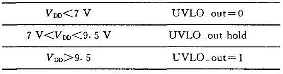 時,比較器跳轉,N1開通,UVLO-out開始變l.通過合理設置R1、R2、R3值就可以使VDD1=9.5 V,VDD2=7V,即VDD上升到9.5 V時UVLO輸出為零,芯片正常工作; VDD下降到7 V 時芯片停止工作。