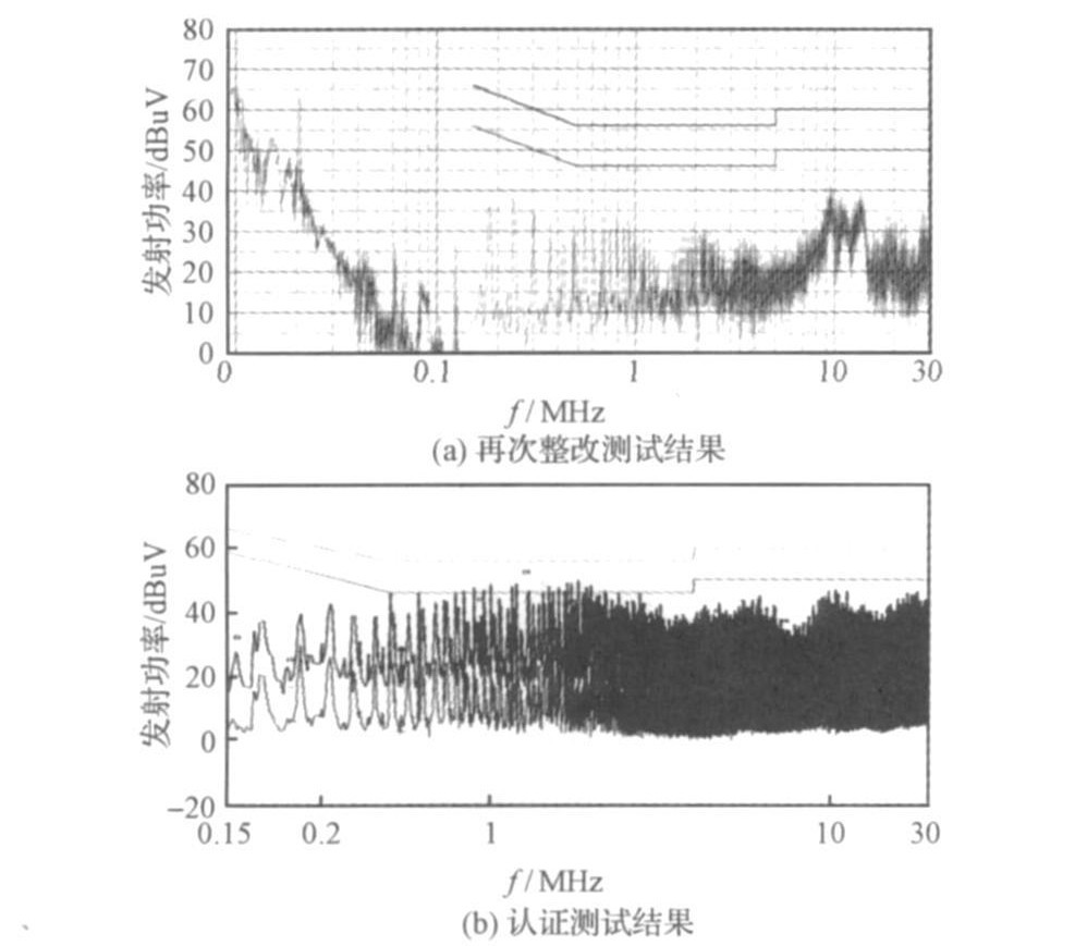 從圖6測試的結果分析可知, 在2MHz附近干擾信號幅值相對原先的最大降幅為5 dBuV, 但是在0. 8MHz~1MH z頻率領域干擾幅度有所增加, 峰值較為靠近標準限值。雖然預測試的結果已經低于標準限值, 但是為了能一次性通過認證就必須留出余量。再次改進具體措施為:
