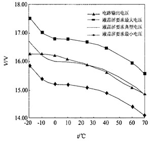 進行了模擬計算,結果如表1,由表1所得曲線如圖4。表1和圖4表明電路輸出和液晶屏的要求吻合,電路能夠保證液晶在-20~70°C 范圍內正常顯示。而且高、低溫測試結果證實,在-20~70 °C范圍內對比度正常。