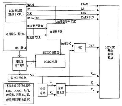 液晶顯示器對比度的調節可分為硬件調節和軟件調節。圖5的電路具有軟、硬件調節功能。其中R1是可調電阻,可調節VLCD的電壓,從而液晶顯示器的對比度得到調節;電路中還可利用CPU與數模轉換器(DAC)相結合來控制DC/DC的反饋端的電壓,從而實現軟件調節液晶顯示器的對比度。