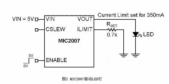 圖2展示的是輸出和LED相連的配電開關(guān)。MIC2007可以在2.5V-5.5V的輸入電壓下工作。它是通過(guò)外置電阻器Rset來(lái)設(shè)定限流值的。限流值等于CLF/Rset,CLF為限流因數(shù),一般是245(請(qǐng)參考MIC2007數(shù)據(jù)表暨電氣性能表),而Rset 則等于0.7 kΩ。因此,限流值就是245/0.7 kΩ = 350 mA。
