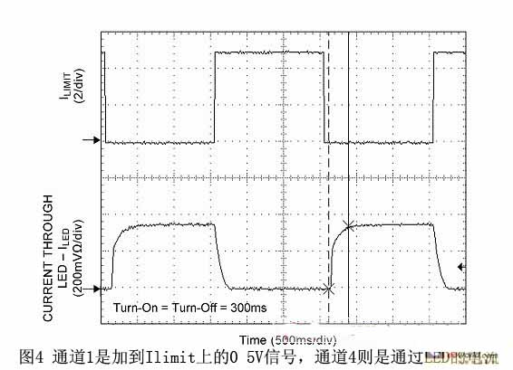圖4中通道1是加到Ilimit上的0 5 V信號(hào),而通道4則是通過(guò)LED的電流(Iled; 開啟時(shí)間= 關(guān)閉時(shí)間= 300 ms)。