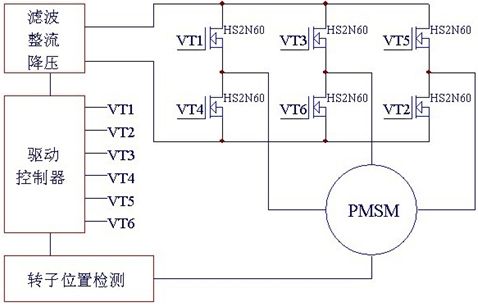 方案中無刷直流電機(BLDCM)輸入(110V/220V)交流電,經轉換器(converter)轉成直流,要轉入電機線圈前須先將直流電壓由換流器(inverter)轉成3相電壓來驅動電機。換流器(inverter)由6個功率MOSFET(VT1~VT6)分為上臂(VT1、VT3、VT5)/下臂(VT2、VT4、VT6)連接電機作為控制流經電機線圈的開關。MCU提供PWM(脈沖寬度調制)決定功率MOSFET HS2N60IB開關頻度及換流器(inverter)換相的時機。