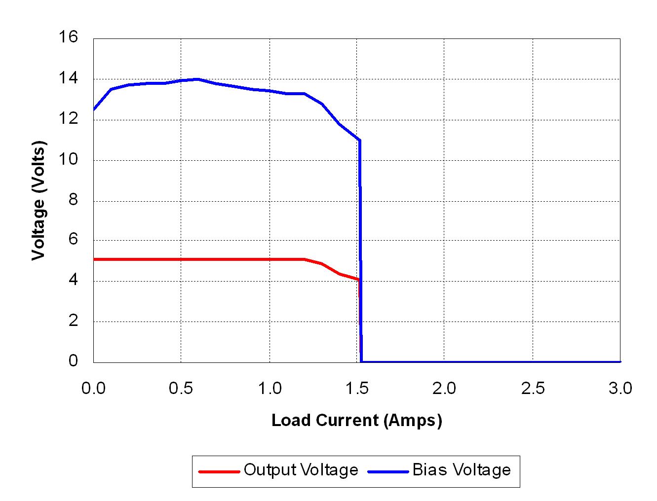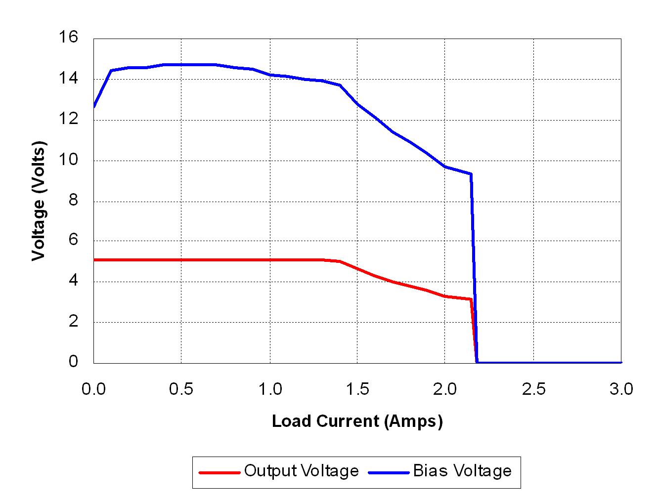 圖3顯示了輸出和偏置電壓與圖2所示電路負(fù)載電流的對比情況。輸出V-I特性非常接近于圖1所示理想情況。負(fù)載電流達(dá)到約1.3A時(shí)開始功率限制。隨著負(fù)載增加,輸出電壓開始下降。由于偏置電壓是輸出電壓的反映,因此它也開始下降。偏置電壓降至9V關(guān)閉水平以下時(shí),PWM控制器關(guān)閉。