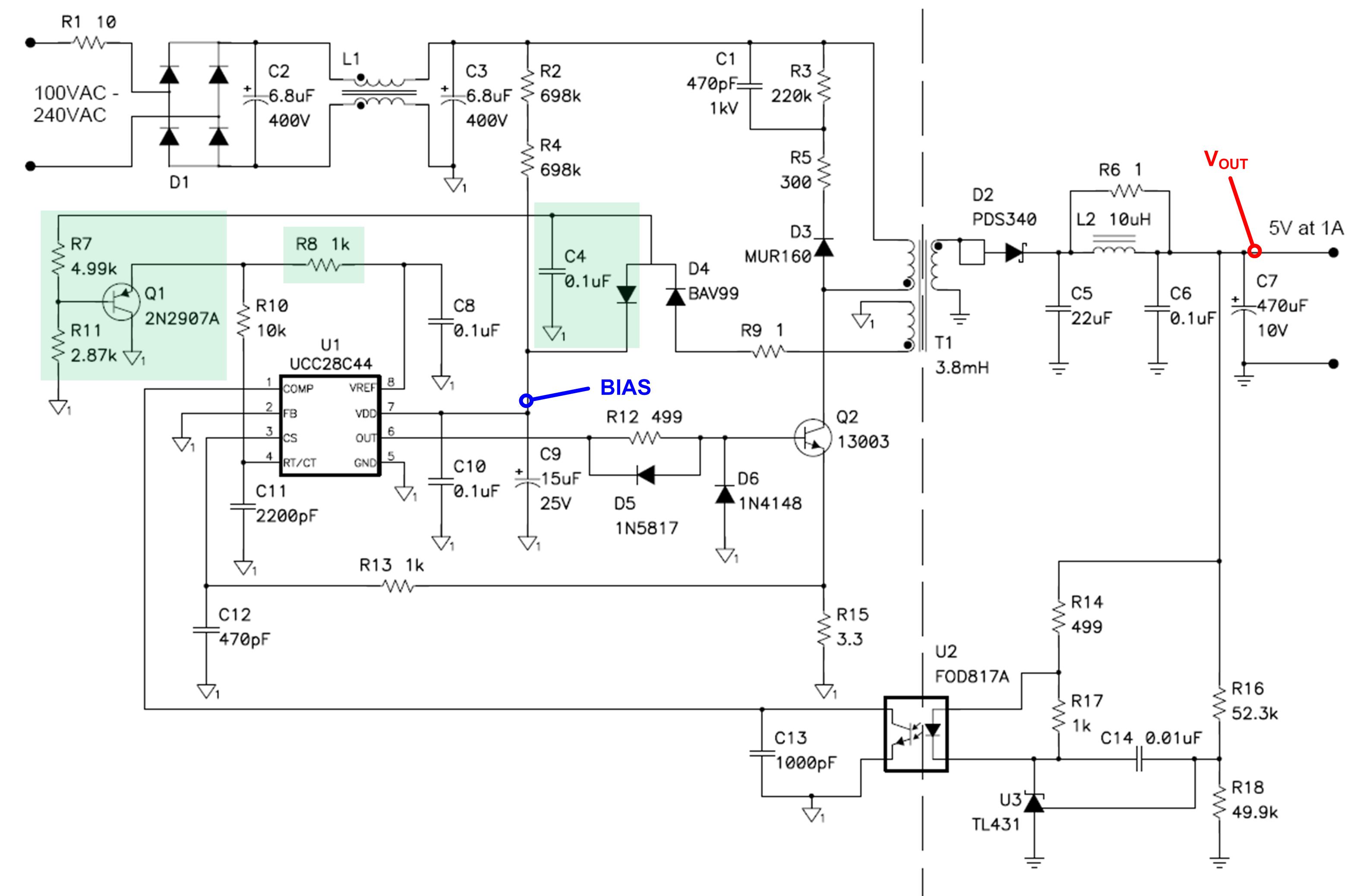 用于創(chuàng)建這種改進(jìn)型電流限制而增加的一些組件突出顯示在圖4所示原理圖中。對內(nèi)部振蕩器編程,通過R10、R8和C11設(shè)置反向轉(zhuǎn)換器的開關(guān)頻率。一個(gè)內(nèi)部5V源通過R10和R8對C11充電。隨著偏置電壓下降,R7和R11的電阻分壓器開啟Q1,并優(yōu)先于內(nèi)部5V源進(jìn)行控制,從而降低開關(guān)頻率。偏置二極管(D4)現(xiàn)在必須為一種雙串聯(lián)二極管,這樣R7和R11才不會(huì)在啟動(dòng)期間使控制器的電流改道。需正確選擇R7和R11的值,以便讓Q1在正常運(yùn)行期間處于關(guān)閉狀態(tài),僅在偏置電壓降至約12V以下時(shí)才開啟。