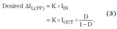 設(shè)計任何 PWM 開關(guān)調(diào)節(jié)器的首要步驟之一便是決定允許多少電感紋波電流 ΔIL(PP)。過多會增加 EMI,而過少又會導(dǎo)致不穩(wěn)定的 PWM 運行。一般原則是給 K 分配一個介于 0.2 和 0.4 平均輸入電流之間的值。理想紋波電流的計算如下: