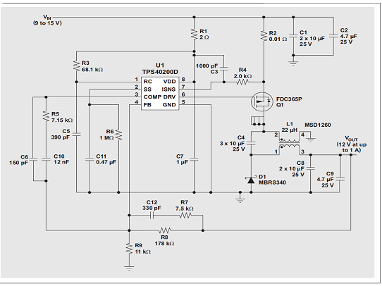 就本例而言,諸多要求都是針對一個 η= 0.9 峰值效率的 12-V、1-W 電源。負(fù)載為穩(wěn)態(tài),因此幾乎看不到負(fù)載瞬態(tài)。2-A 輸入電源為 9 到 15V。我們選擇了異步電壓模式控制器即 TI TPS40200,其工作在 340 和 460kHz 之間的開關(guān)頻率下。輸入端和快速電容器的最大允許紋波分別為彼此交叉最大電壓的 1%。最大輸出紋波為 25 mV,而最大環(huán)境溫度為 55ºC。由于 EMI 并不是問題,通過使用最小輸入電壓,我們選擇了具有更低電感值的電感。下一頁的表 1 概括了前面介紹的一些設(shè)計計算方法。我們忽略了方程式 7 到 9 以及方程式 11,因為使用了高 RMS 電流額定值的低 ESR 陶瓷電容。