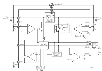 任何可高效地滿足上述小到中電流超級電容器充電器 IC 設計限制的解決方案都會包括一個面向兩節串聯超級電容器和基于充電泵的充電器以及自動容量平衡和電壓箝位。凌力爾特已經為這類應用開發出了一個簡單但尖端的單片超級電容器充電器 IC,該 IC 不需要電感器,也不需要平衡電阻器,提供了反向隔離,并有多種工作模式,而且靜態電流還很低。