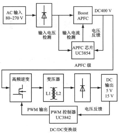 圖2 采用兩級(jí)型APFC的高功率因素開關(guān)電源結(jié)構(gòu)
