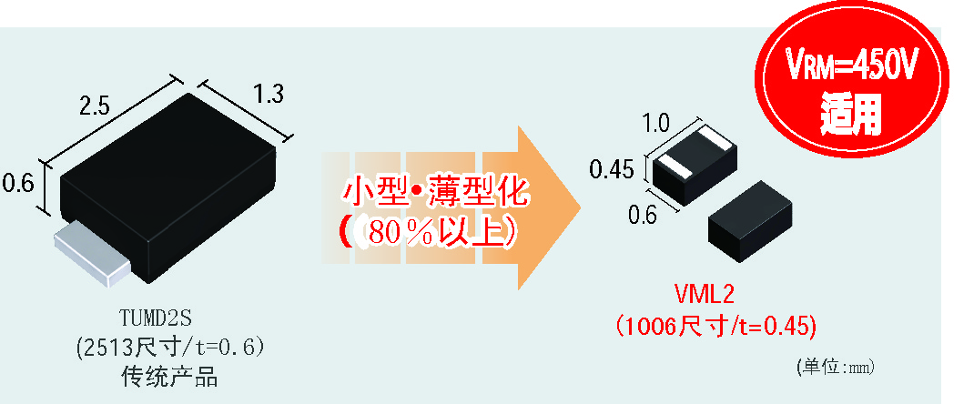 這次,羅姆通過改善結(jié)構(gòu)設計和裝配工藝使封裝得到優(yōu)化,成功開發(fā)出了世界最小的“VML2”封裝(1006尺寸∶1.0mm×0.6mm)快速恢復二極管。與傳統(tǒng)的2513尺寸(2.5mm×1.3mm)相比,體積減少約86%。不僅體積小巧,高達450V耐壓特性也是其特長之一。