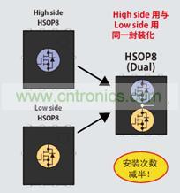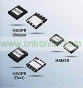 根據不同用途,提供3種小型封裝。HSMT8比HSOP8的安裝面積減少了65%,為節省空間做出巨大貢獻。而且,產品陣容中還包括DC/DC電源電路中的高邊(High Side)用MOSFET與低邊(Low Side)用MOSFET復合化的新封裝HSOP8(Dual)。不僅安裝面積減小,而且還可有助于減少安裝次數。